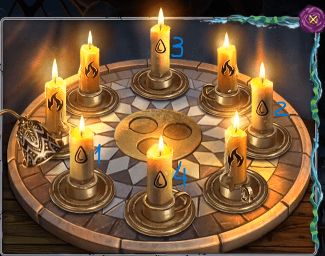 The candles puzzle is to put out the candles in the correct order. The correct order is marked on the picture below.