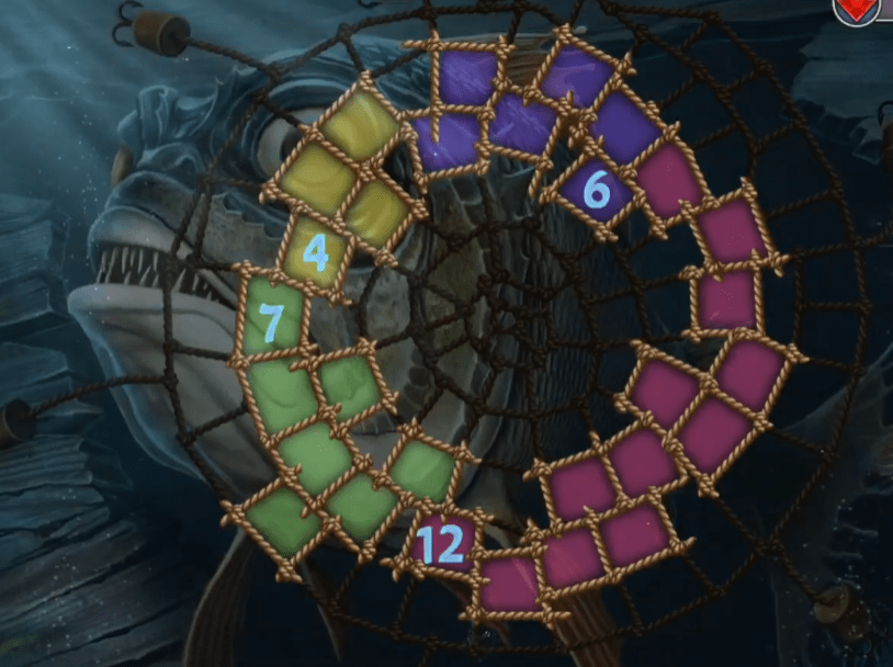 In the Flying Dutchman, to catch the electric fish, you need to solve the puzzle by selecting a number and drag it to color the cells in its section. It is easy but it ca be confusing too because the actual number need to count too.