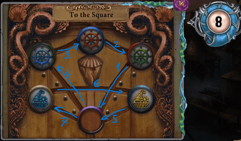 To get to the city square, you need to solve the door lock puzzle in 8 moves. Below is the solution.